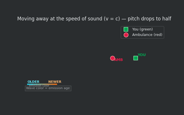 The ambulance recedes as fast as the waves propagate along the line of motion. Audio arrives at half speed (pitch dropped an octave) because each emission travels an extra (c\,\Delta t) before reaching you.