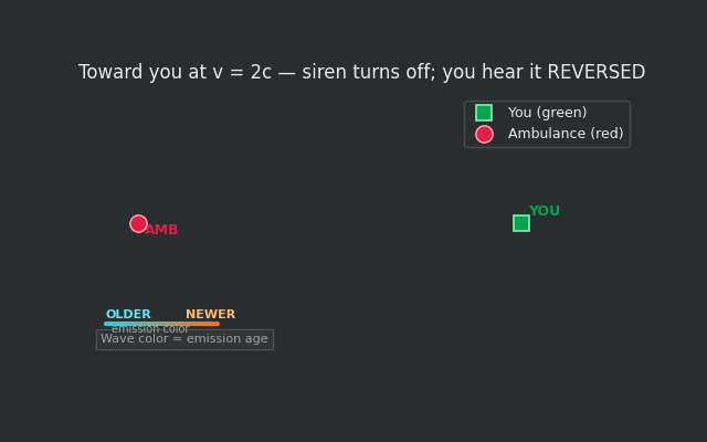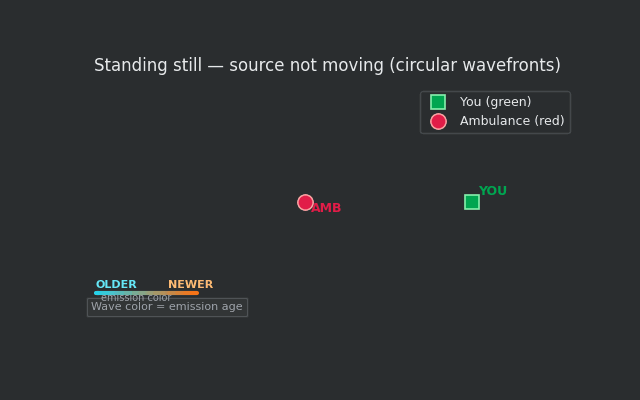 To answer this question let’s draw out the scenarios. Below, the red dot is the ambulance, the green square is you, and wavefront color encodes emission age very explicitly: